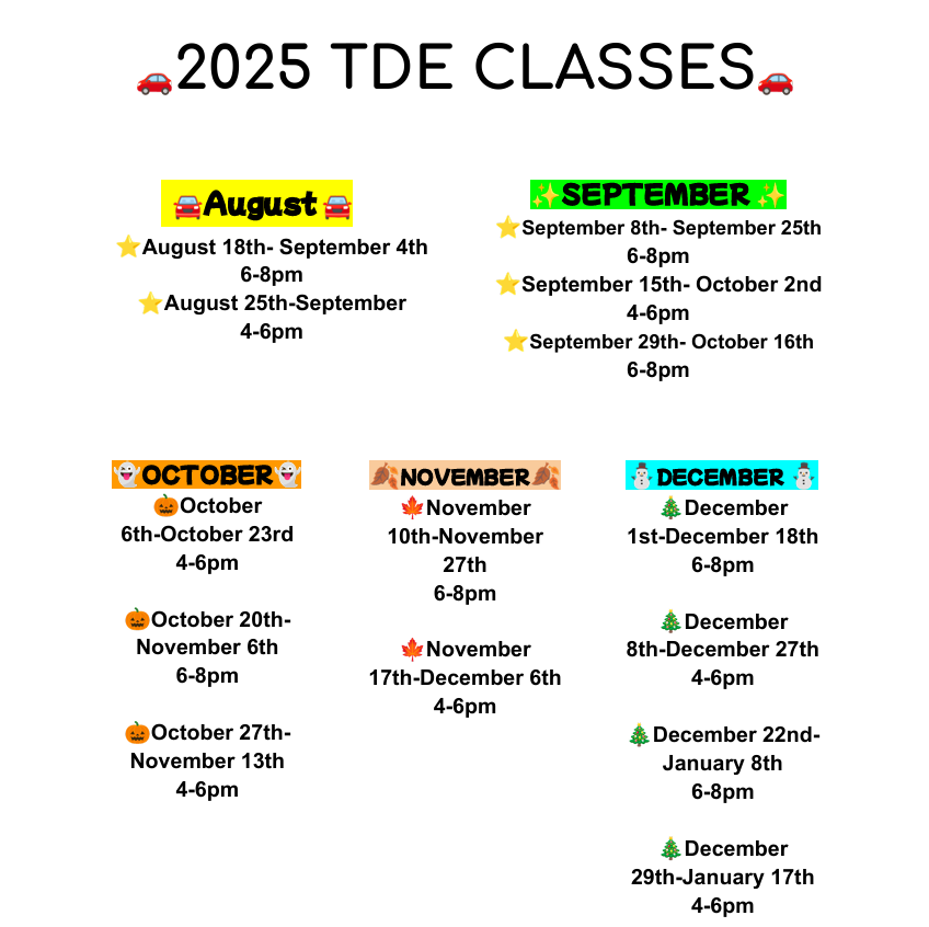 Teen Permit class: It is a 3 week Class from Monday to Thursday, there are 2 classes in one month with the times from either 4pm-6pm or 6pm-8pm depending on the date of the class.
